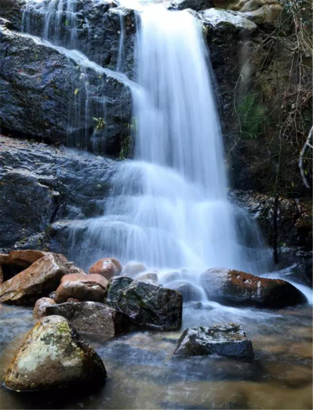 豐水期,遠(yuǎn)遠(yuǎn)的未見(jiàn)其水,便聞其聲,隆隆的水聲如雷鳴般響徹山谷,清澈的山泉水順著山勢(shì)歡快地奔騰而下,水流沖落在瀑布下的巖石上,飛濺起粒粒的水珠,銀白閃亮,就像晶瑩的珍珠正在翻滾跳躍。
