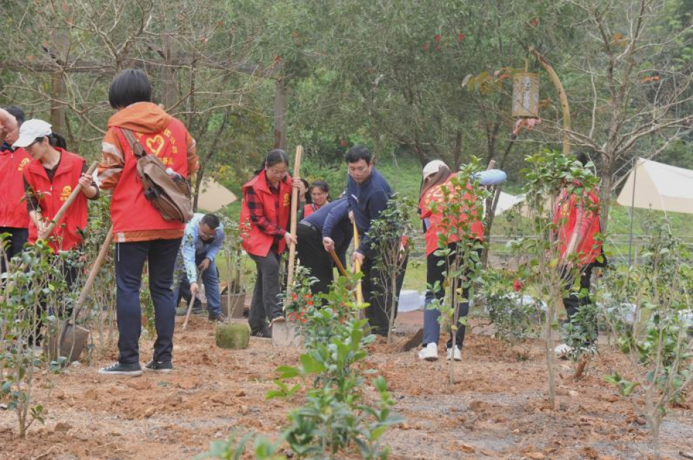 活動(dòng)現(xiàn)場(chǎng),全體人員積極投身于添綠行動(dòng)中,揮鍬鏟土、扶苗填土、提水澆灌,大家分工協(xié)作、相互配合、熱情高漲。經(jīng)過2個(gè)小時(shí)緊張的勞動(dòng),一排排新栽種的桂花、山茶花樹苗亭亭玉立,展現(xiàn)勃勃生機(jī),為初春的景區(qū)大地增添了絲絲活力。