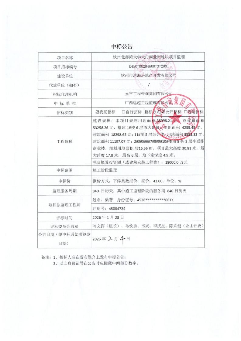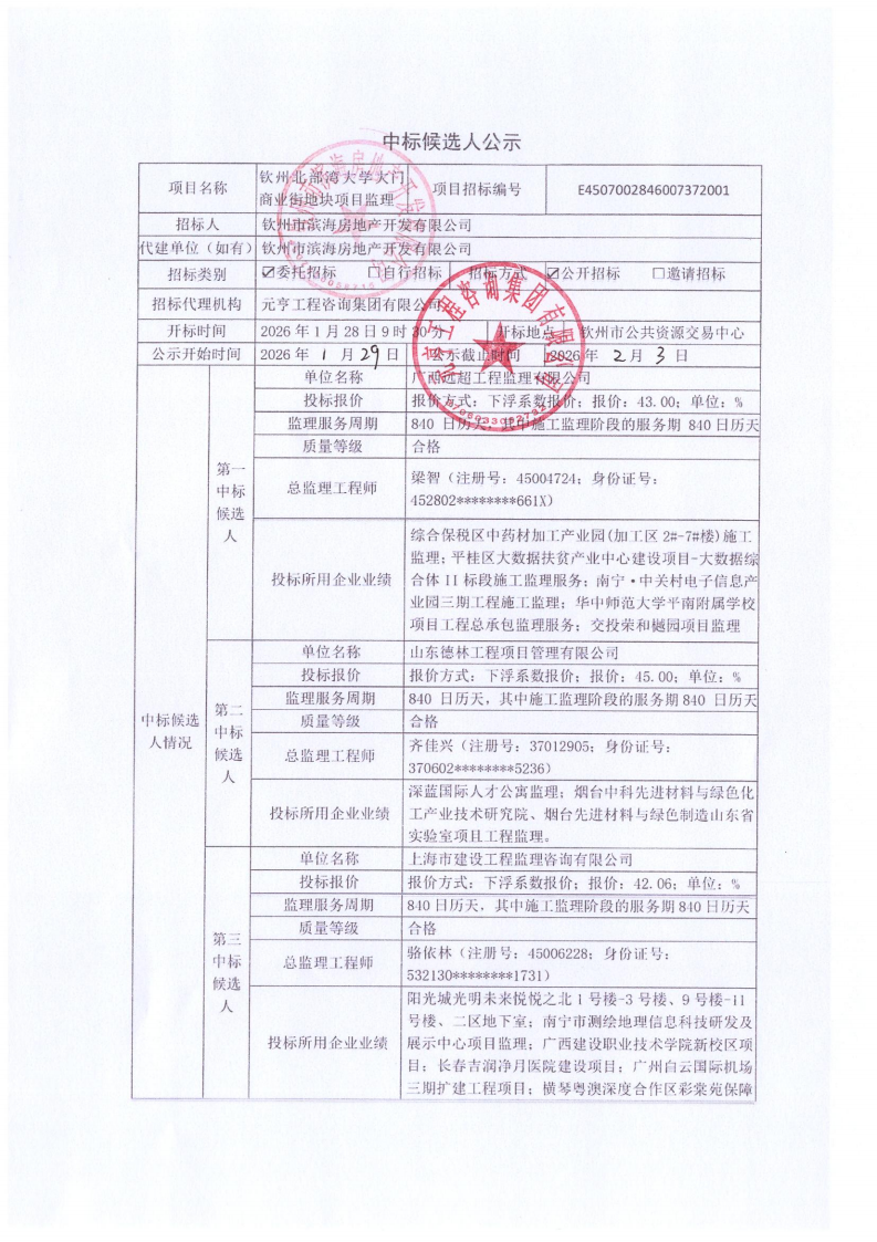 中標(biāo)候選人公示(欽州北部灣大學(xué)大門商業(yè)街地塊項目監(jiān)理)