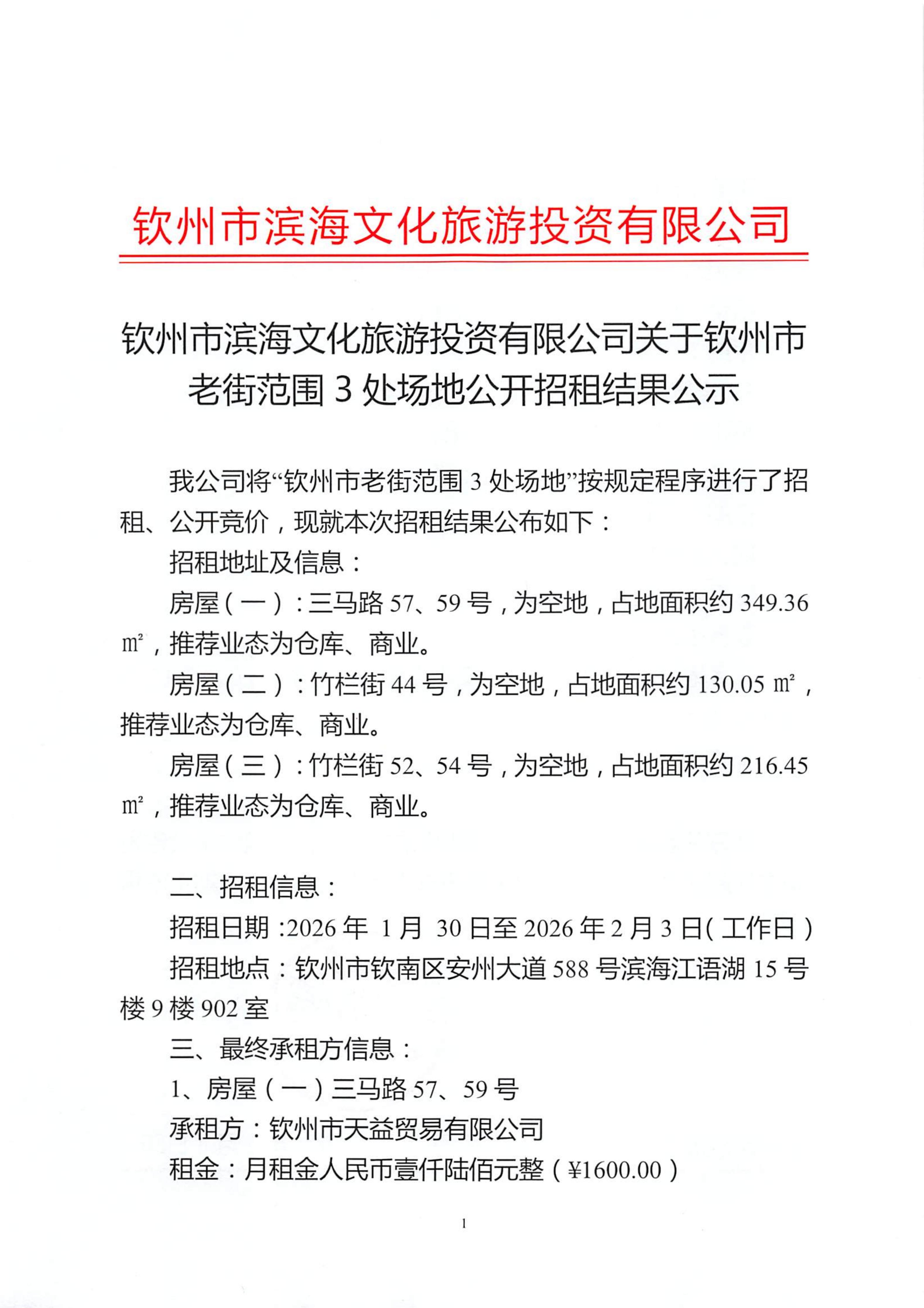 欽州市濱海文化旅游投資有限公司關(guān)于欽州市老街范圍3處公房公開招租結(jié)果公示(三馬路57、59號,竹欄街44號,竹欄街52、54號)