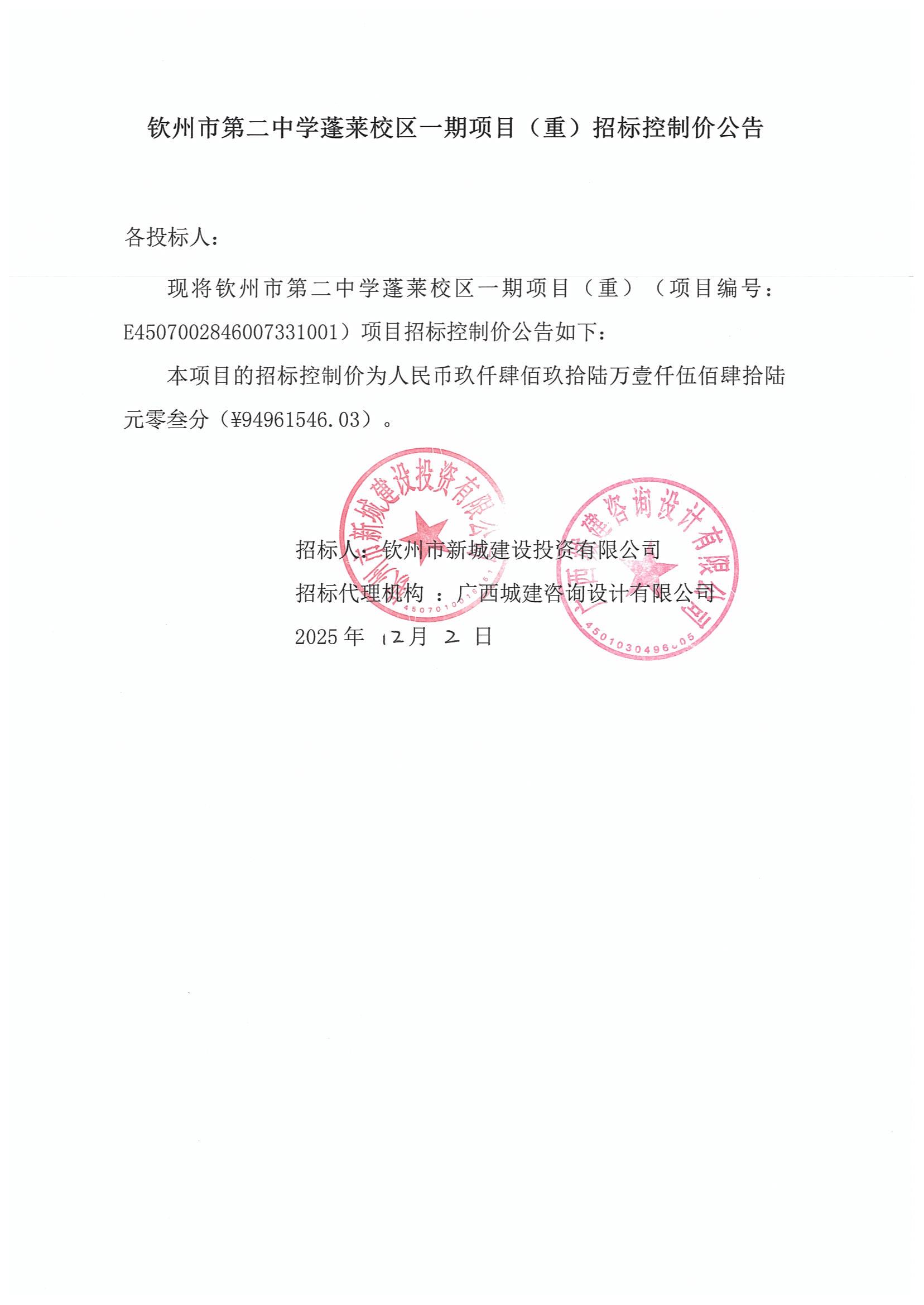 欽州市第二中學(xué)蓬萊校區(qū)一期項(xiàng)目檢測招標(biāo)控制價(jià)公告