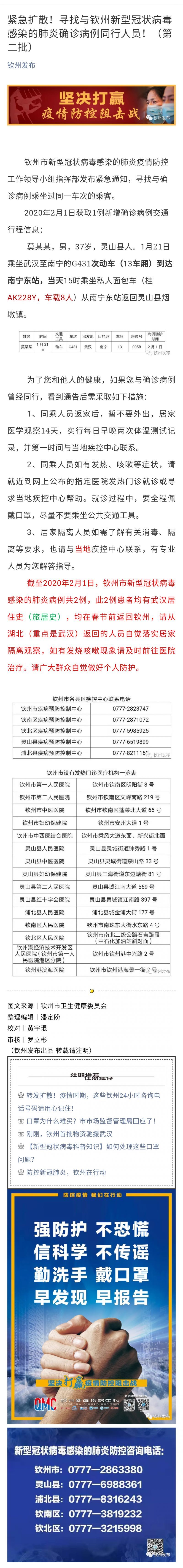 緊急擴散!尋找與欽州新型冠狀病毒感染的肺炎確診病例同行人員!(第二批)