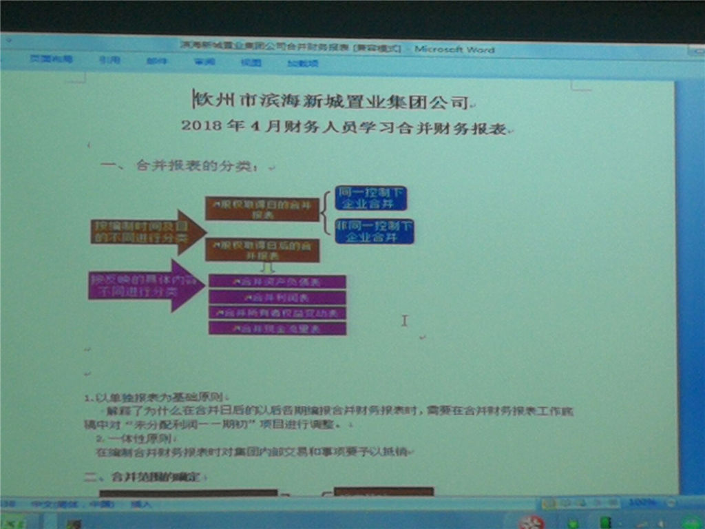 為了提高財務人員財務報表編報質量和工作效率,2018年4月15日上午,計劃財務部李東波經(jīng)理主持召開學習會,學習編制合并報表的相關業(yè)務知識,集團及各子公司全體財務人員參會學習。會上洪家泰副經(jīng)理講解了合并會計報表及附注的編制方法及要求,規(guī)范和統(tǒng)一報表和附注的格式,并針對同一控制下企業(yè)合并及非同一控制下企業(yè)合并的少數(shù)股東權益、歸屬于母公司所有者權益進行了詳細講解。