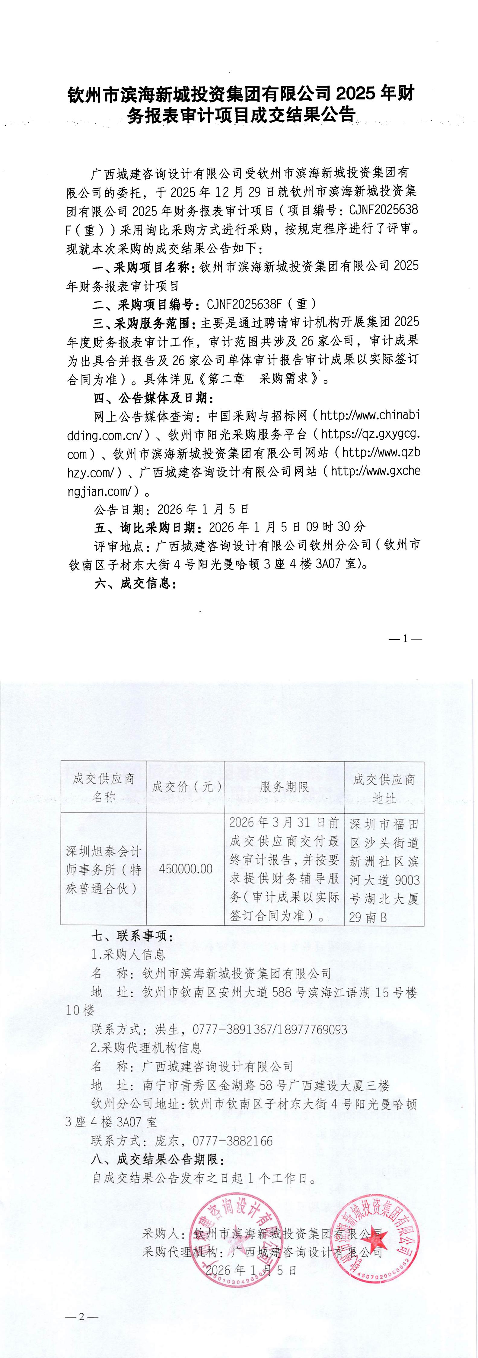 欽州市濱海新城投資集團(tuán)有限公司2025年財務(wù)報表審計項目成交結(jié)果公告
