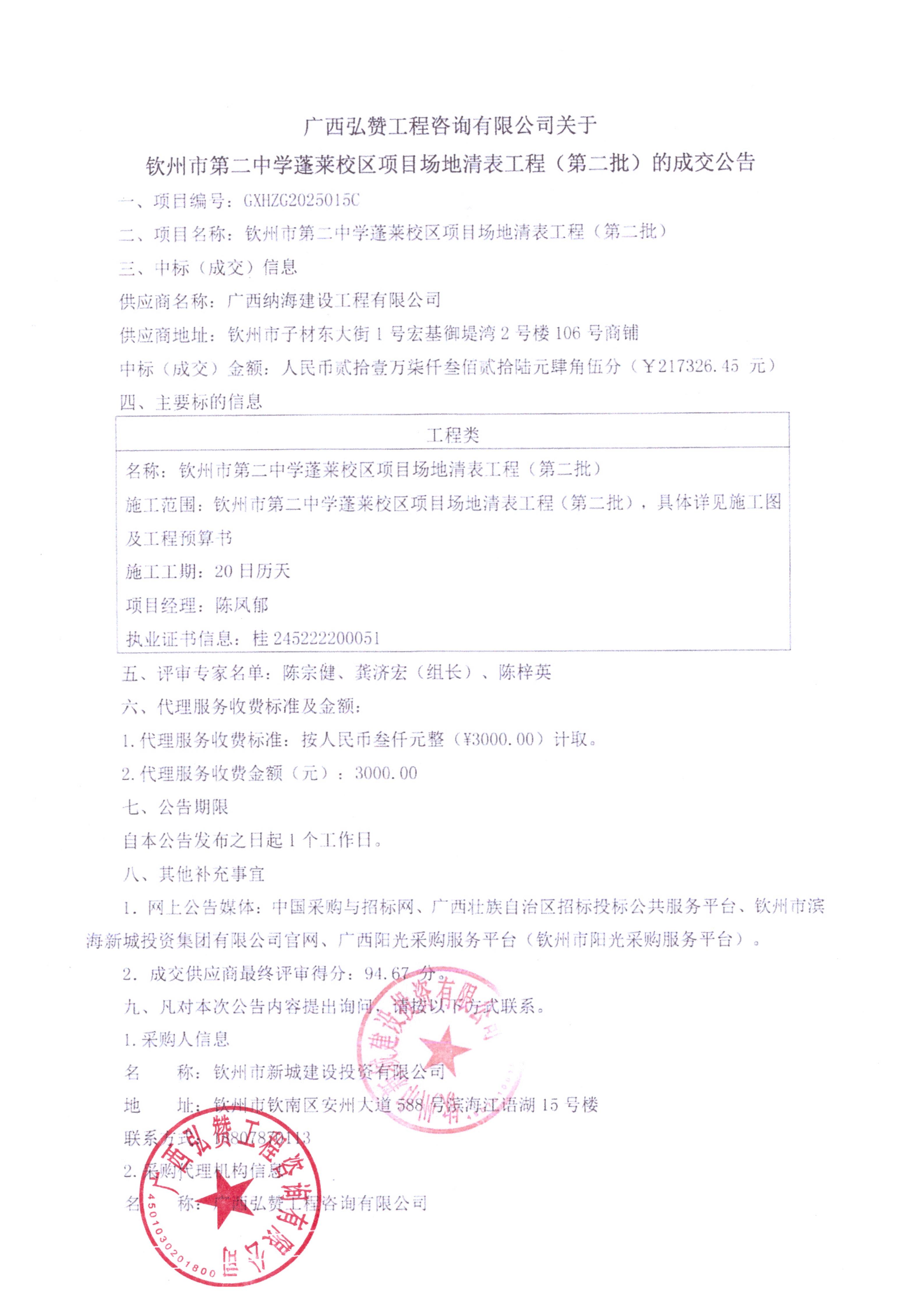 欽州市第二中學(xué)蓬萊校區(qū)項目場地清表工程(第二批)成交公告