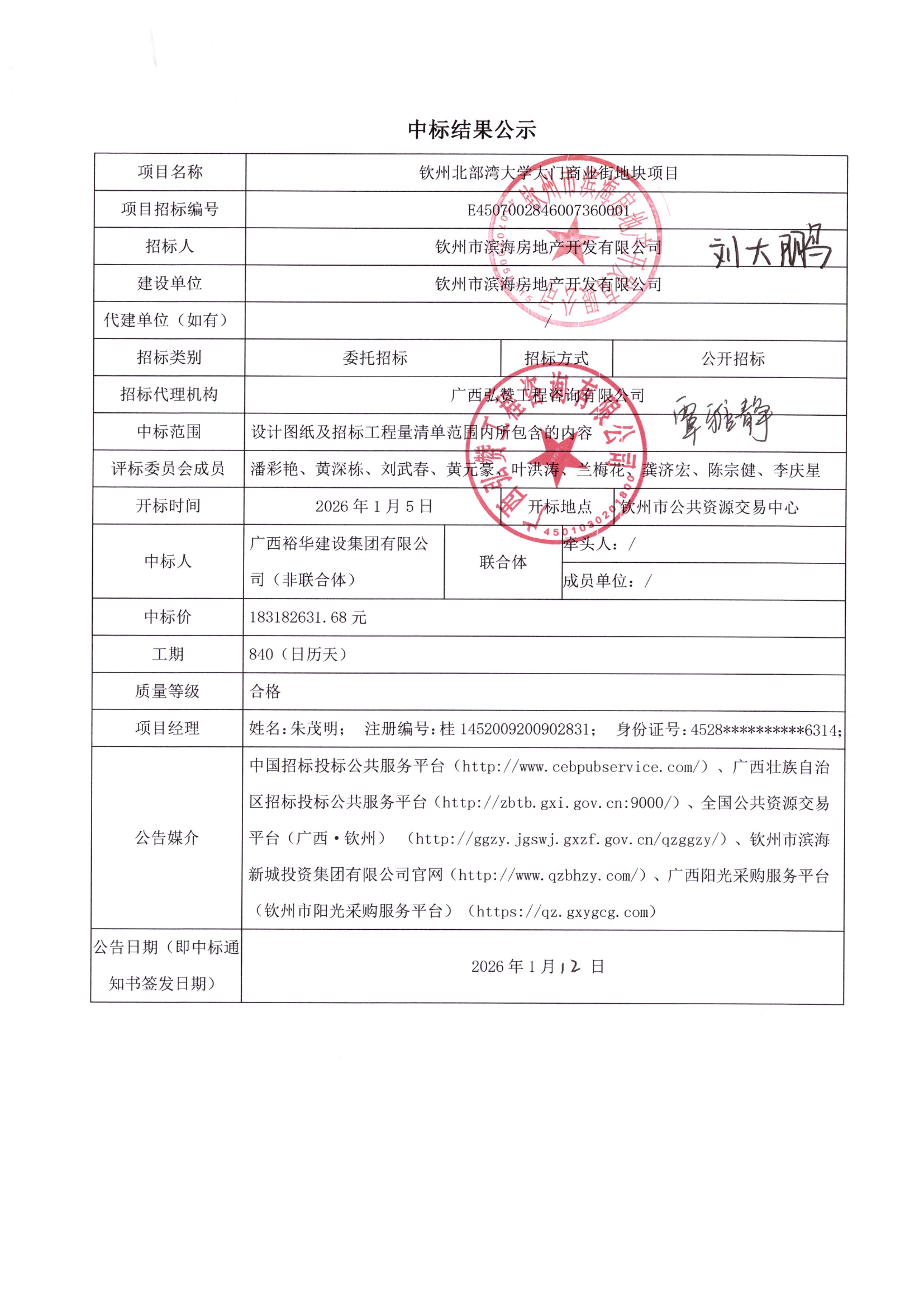 欽州北部灣大學(xué)大門商業(yè)街地塊項目(中標(biāo)結(jié)果公示)