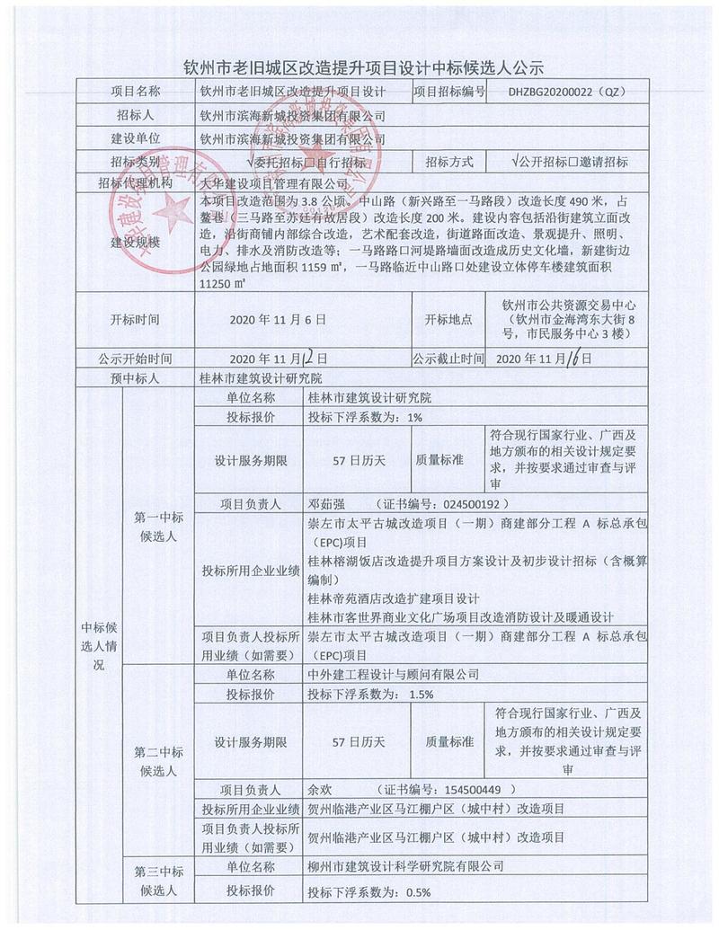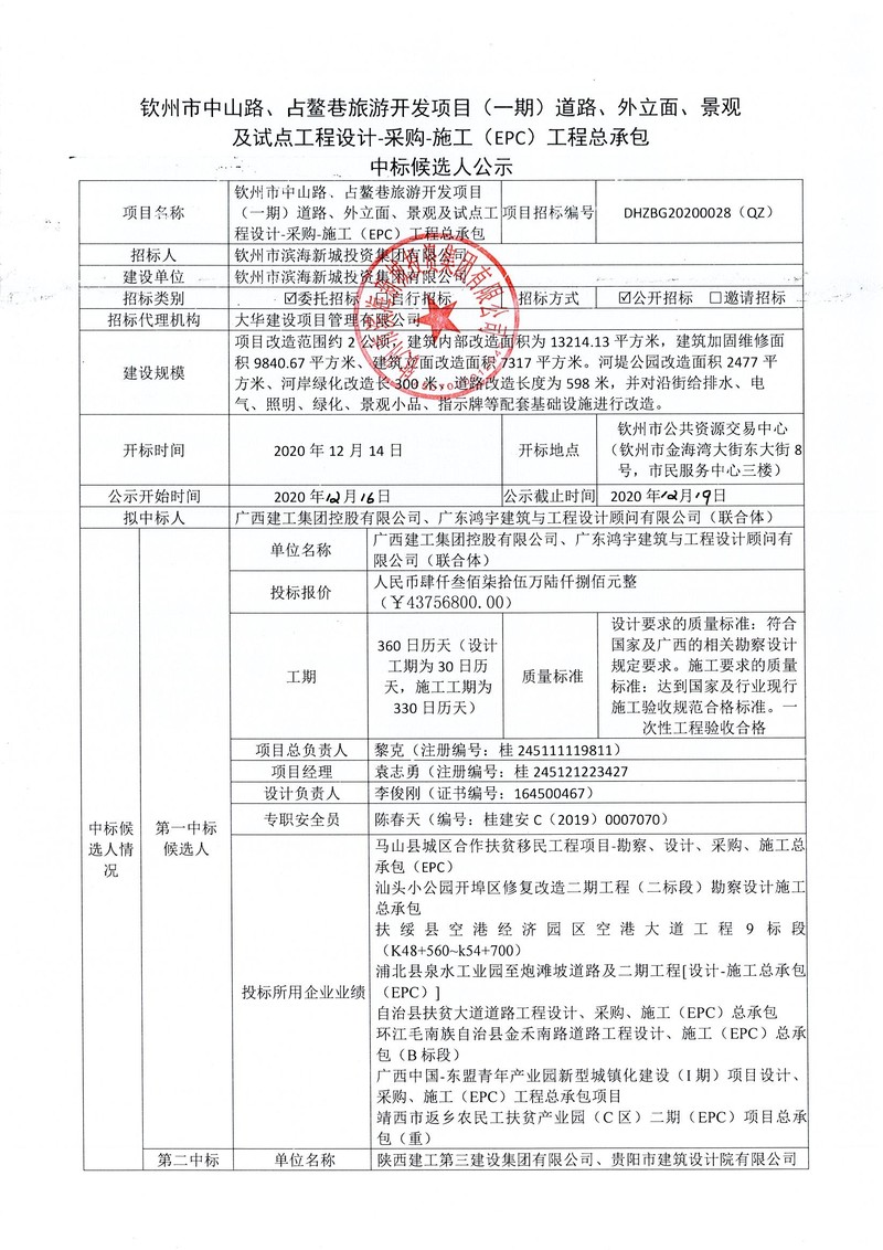 欽州市中山路、占鰲巷旅游開發(fā)項目(一期)道路、外立面、景觀及試點工程設計-采購-施工(EPC)工程總承包中標候選人公示