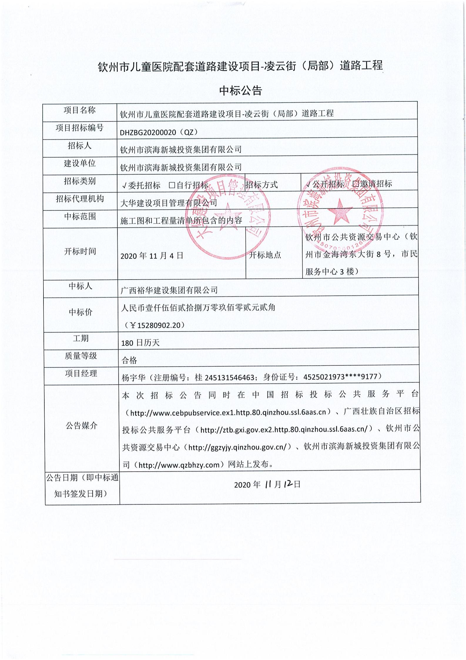 欽州市兒童醫(yī)院配套道路建設項目-凌云街(局部)道路工程中標公告