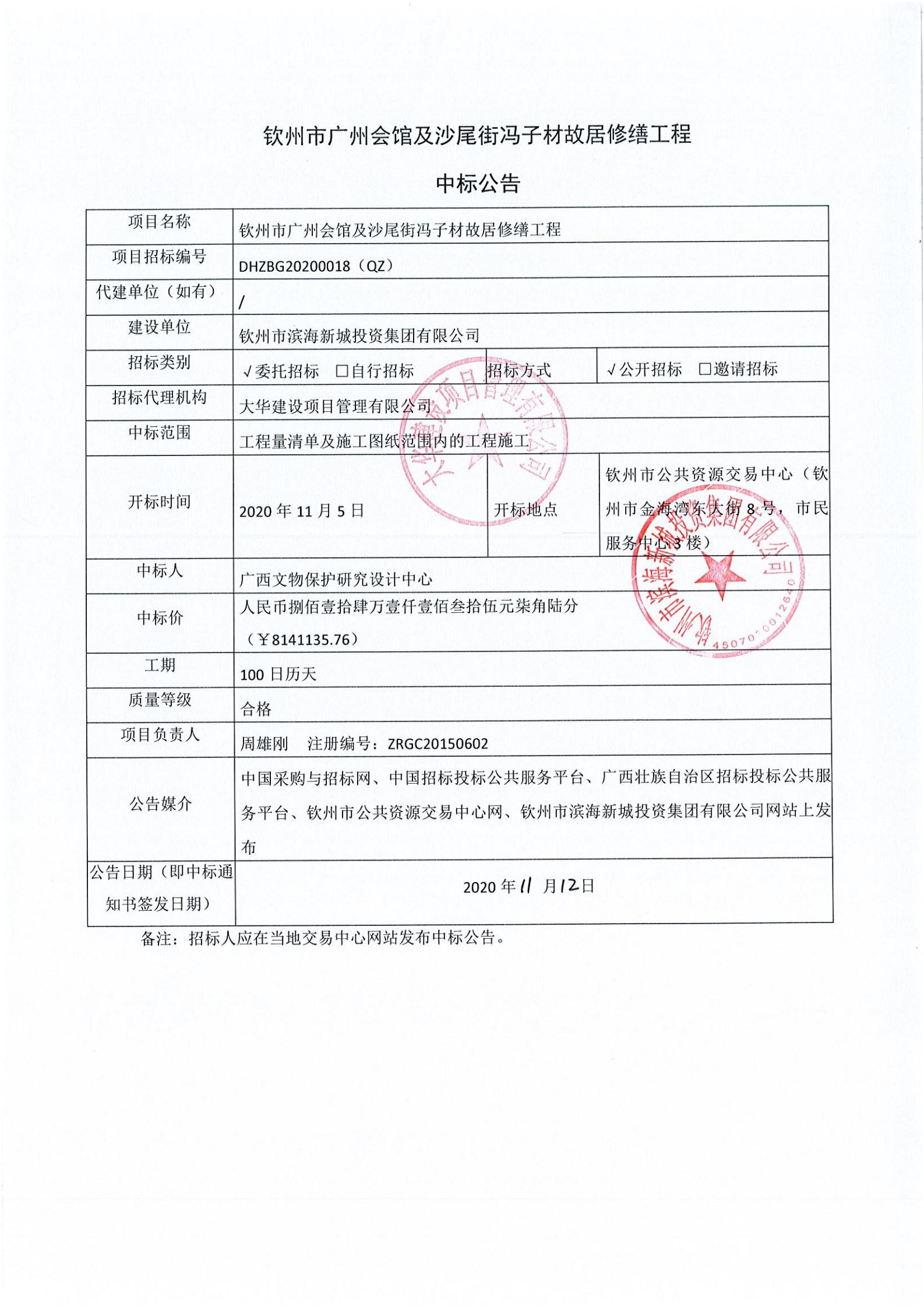 欽州市廣州會館及沙尾街馮子材故居修繕工程-中標候選人公示