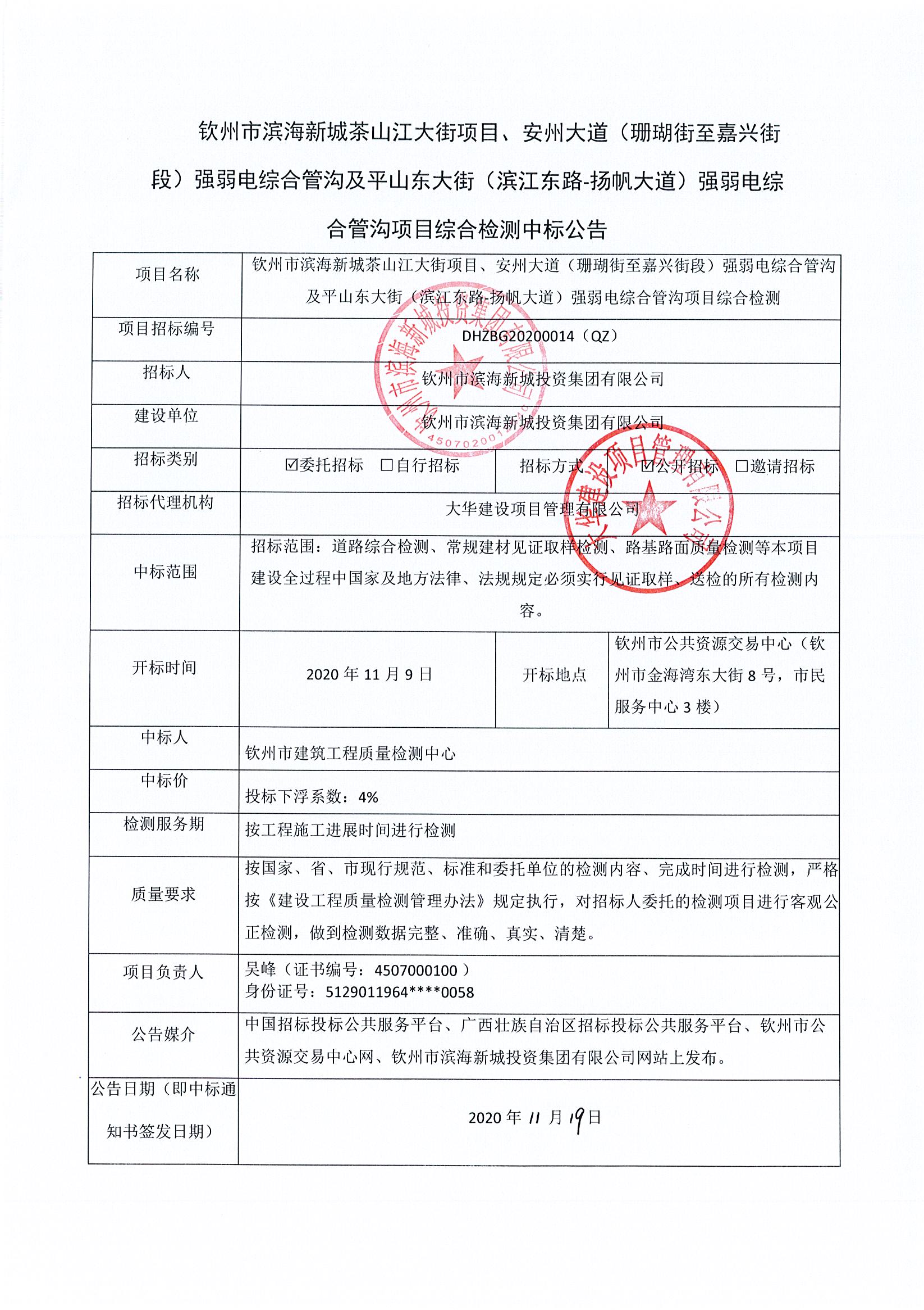 欽州市濱海新城茶山江大街項目、安州大道(珊瑚街至嘉興街段)強弱電綜合管溝及平山東大街(濱江東路-揚帆大道)強弱電綜合管溝項目綜合檢測中標公告