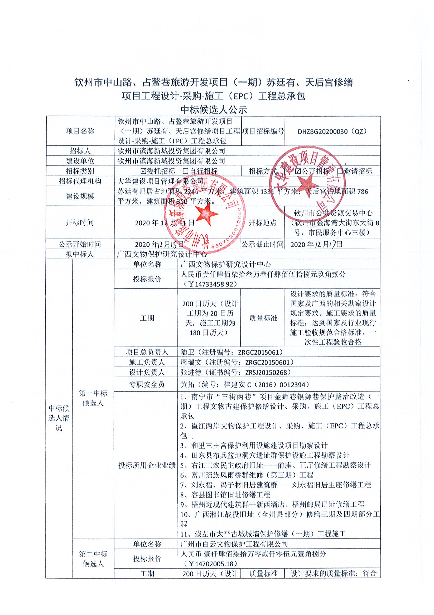 欽州市中山路、占鰲巷旅游開發(fā)項目(一期)蘇廷有、天后宮修繕項目工程設計-采購-施工(EPC)工程總承包中標候選人公示