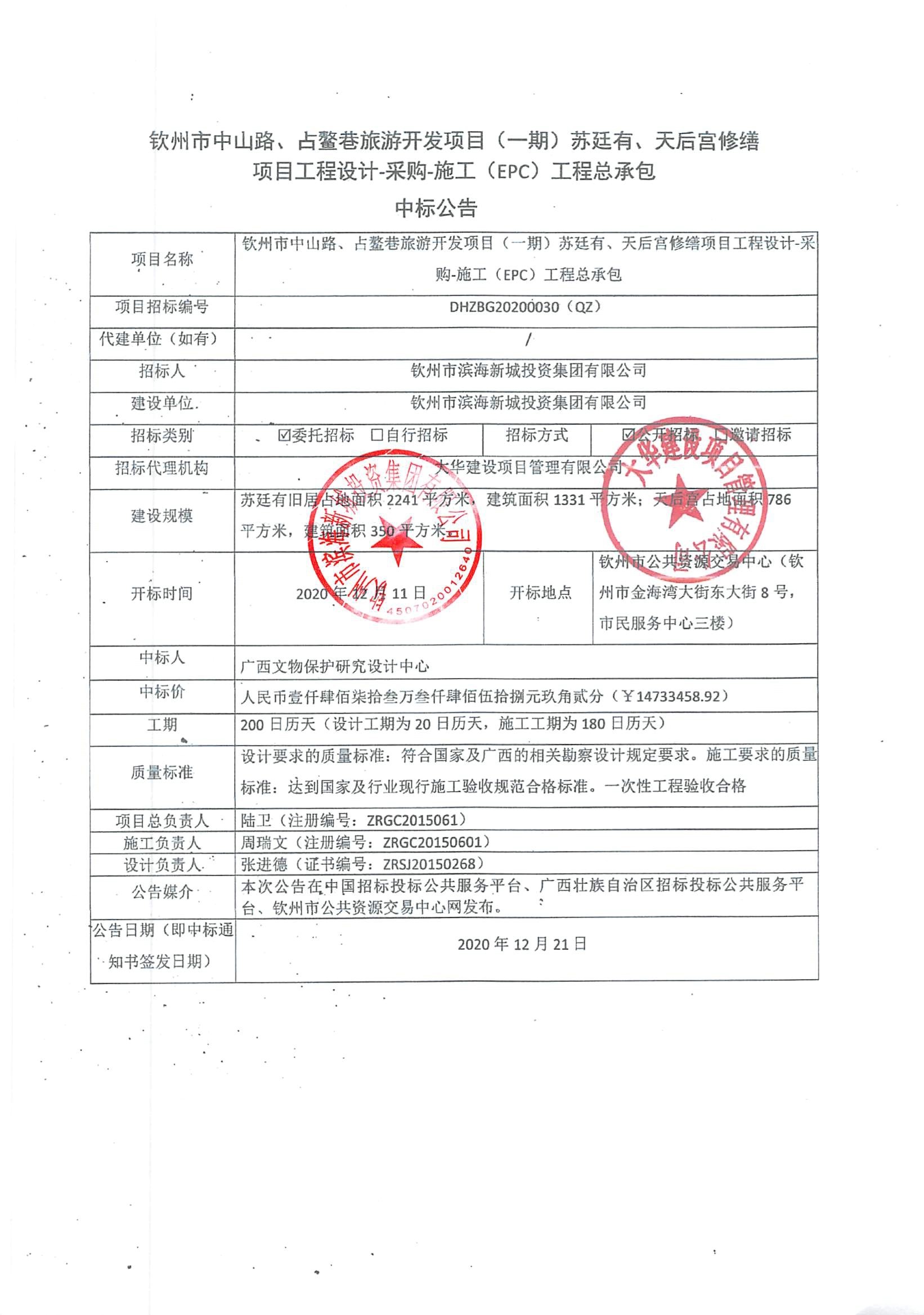 中標公示-欽州市中山路、占鰲巷旅游開發(fā)項目(一期)蘇廷有、天后宮修繕項目工程設計-采購-施工(EPC)工程總承包中標公告