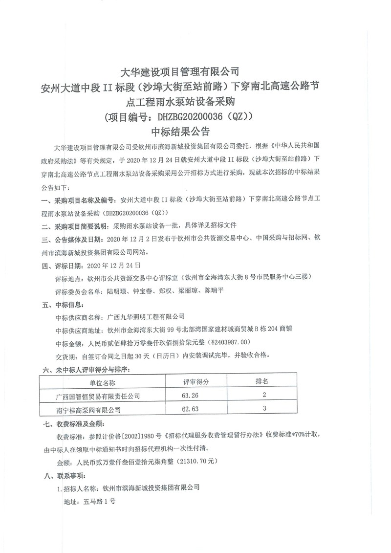 安州大道中段II標段(沙埠大街至站前路)下穿南北高速公路節(jié)點工程雨水泵站設備采購中標結果公告