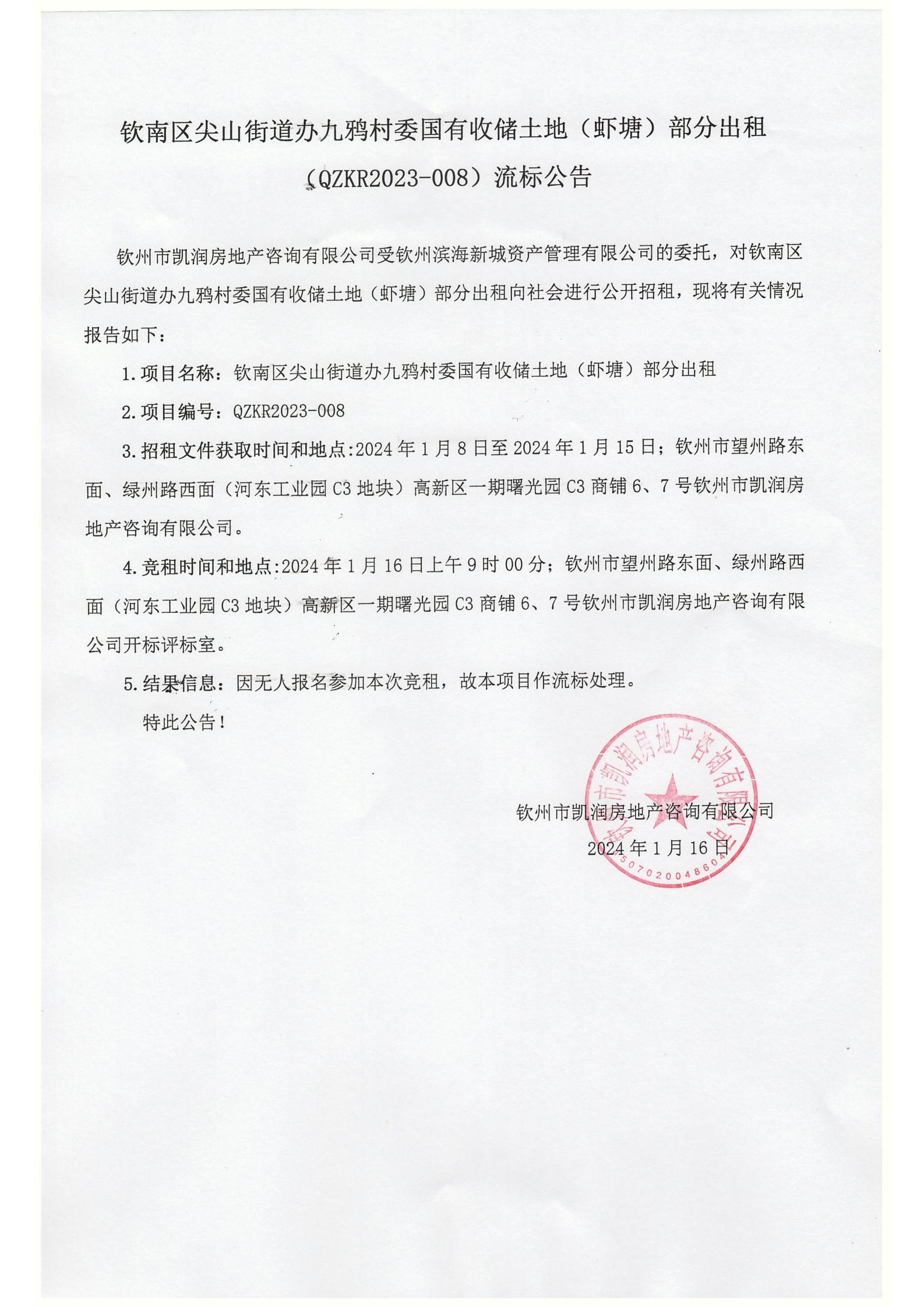 欽南區(qū)尖山街道辦九鴉村委國(guó)有收儲(chǔ)土地(蝦塘)部分出租(QZKR2023-008)流標(biāo)公告