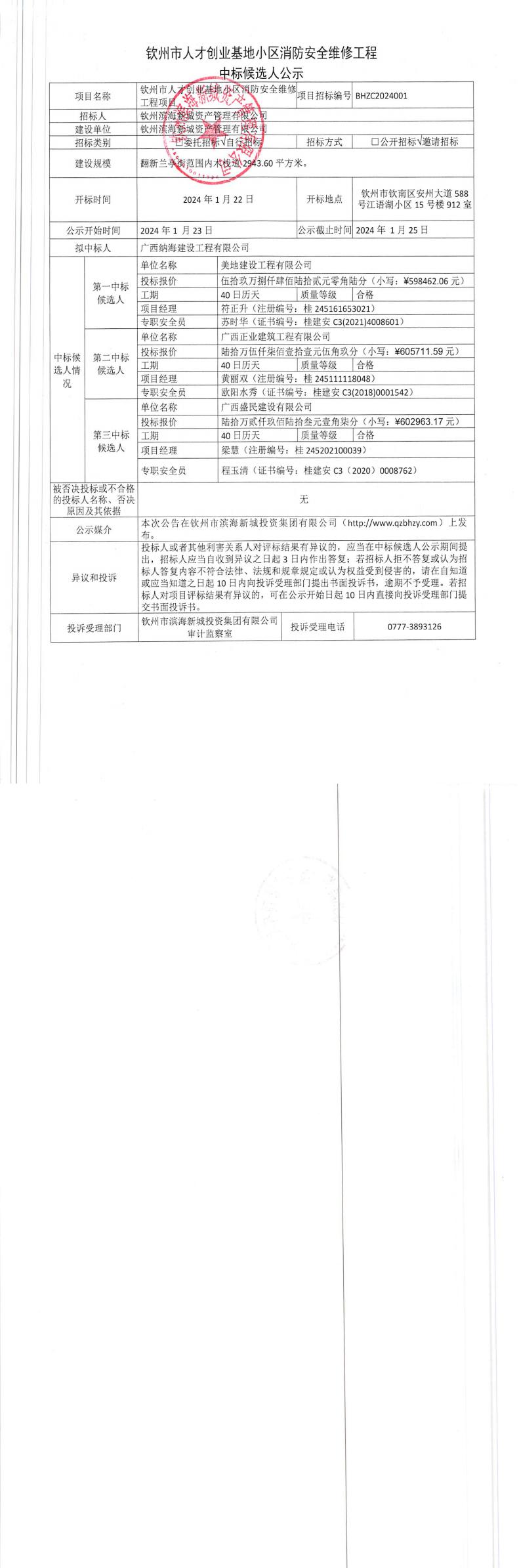 欽州市人才創(chuàng)業(yè)基地小區(qū)消防安全維修工程中標(biāo)候選人公示