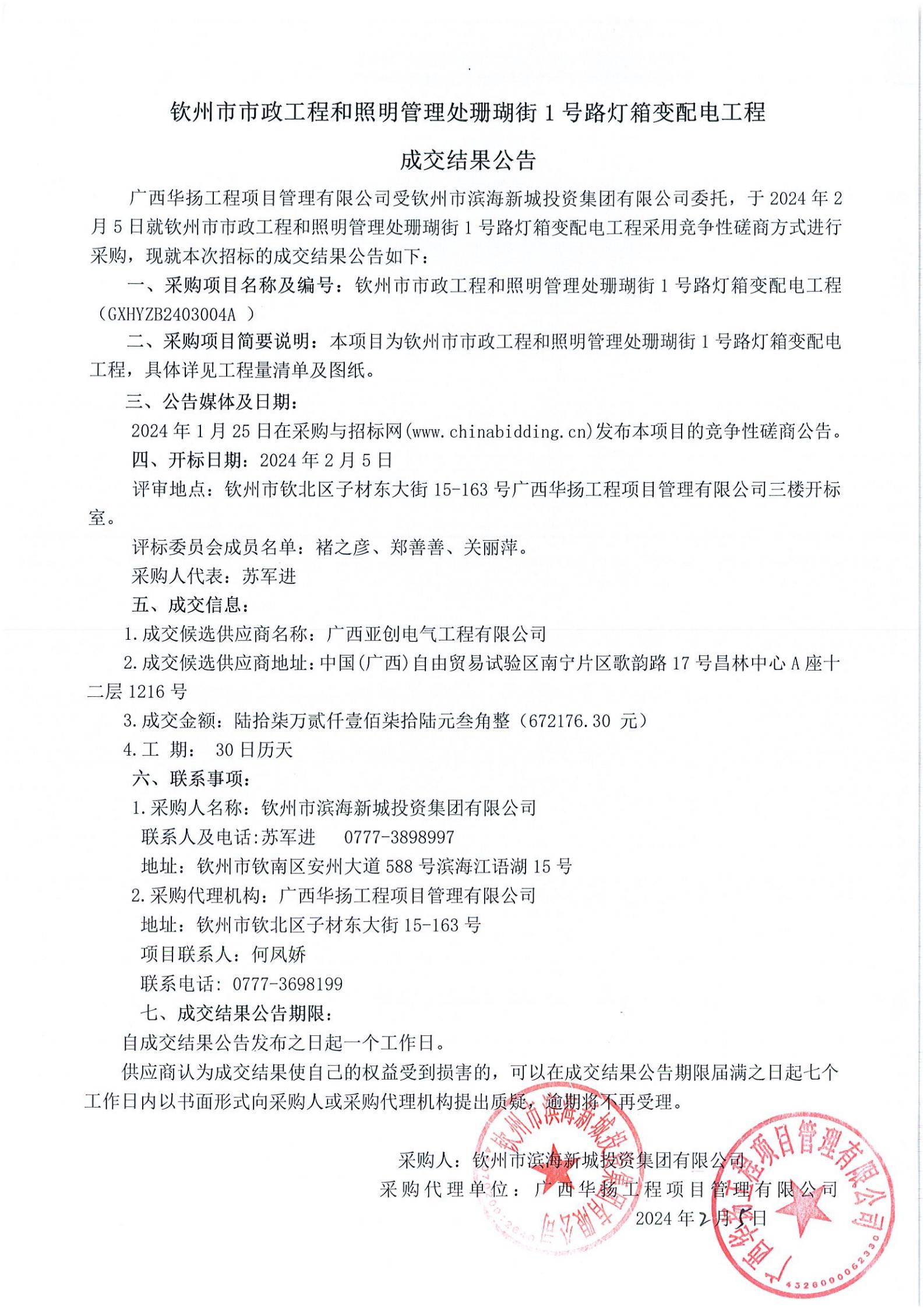 欽州市市政工程和照明管理處珊瑚街1號(hào)路燈箱變配電工程成交結(jié)果公告