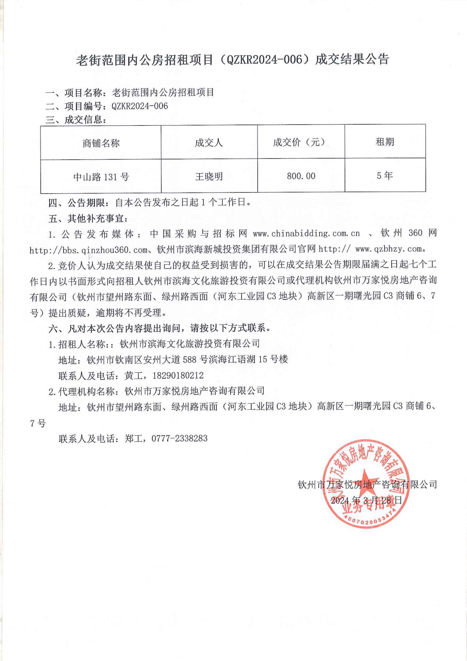 老街范圍內(nèi)公房招租項(xiàng)目(QZKR2024-006)成交結(jié)果公告