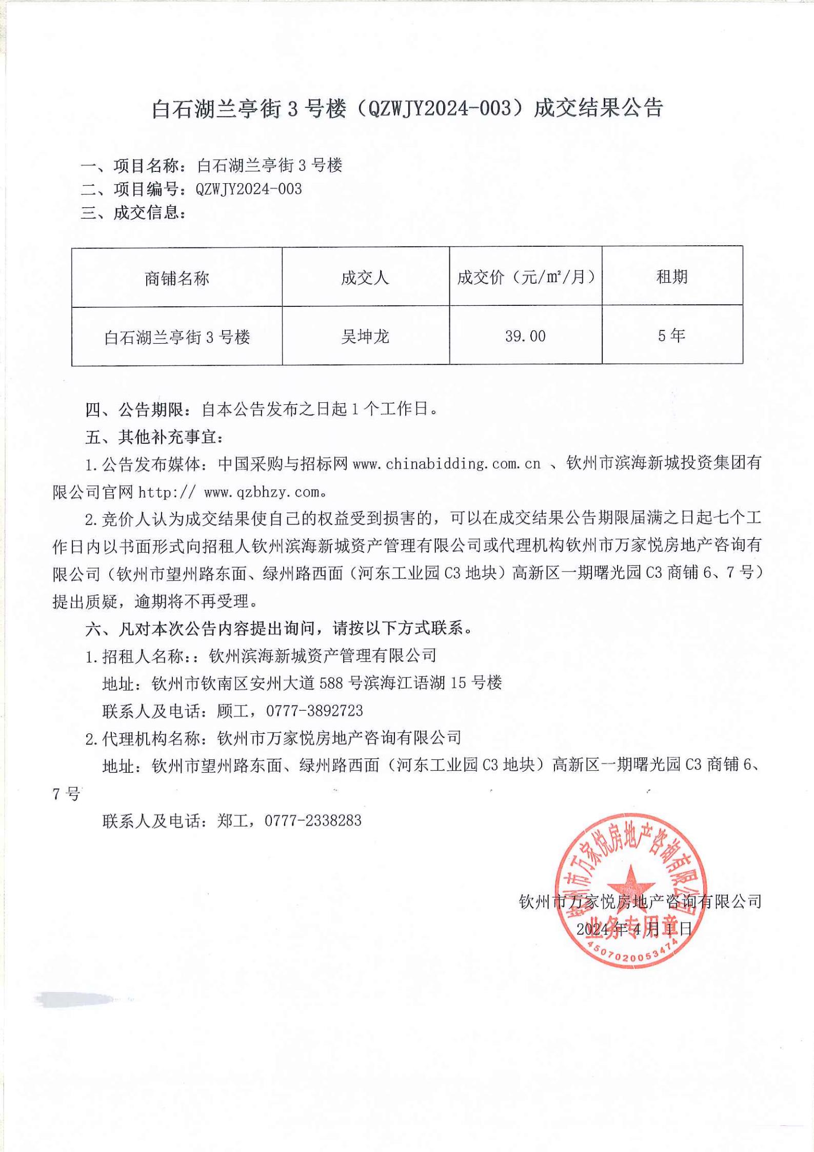 白石湖蘭亭街3號(hào)樓(QZWJY2024-003)成交結(jié)果公告