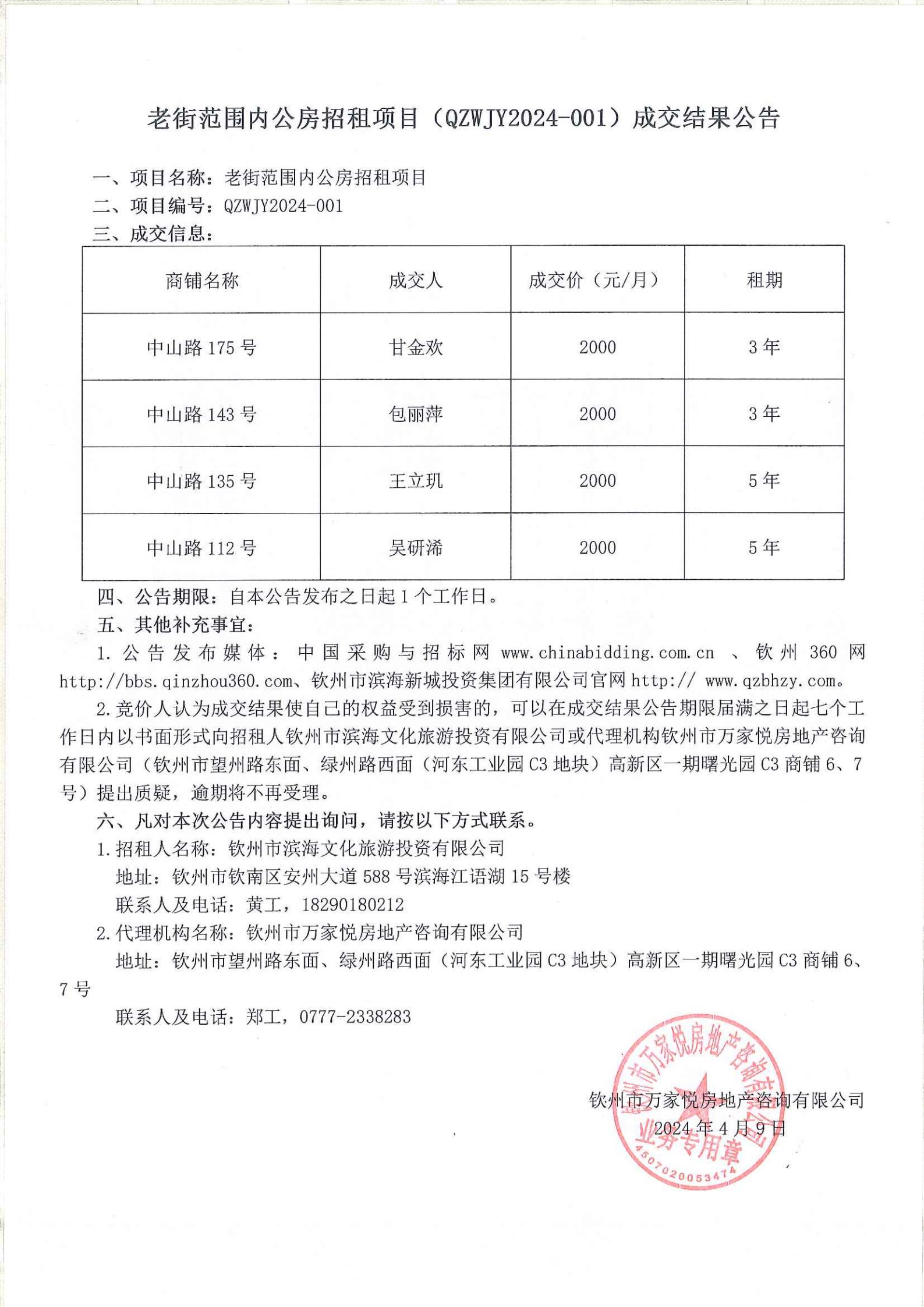 老街范圍內(nèi)公房招租項(xiàng)目(qzwjy2024-001)成交結(jié)果公告
