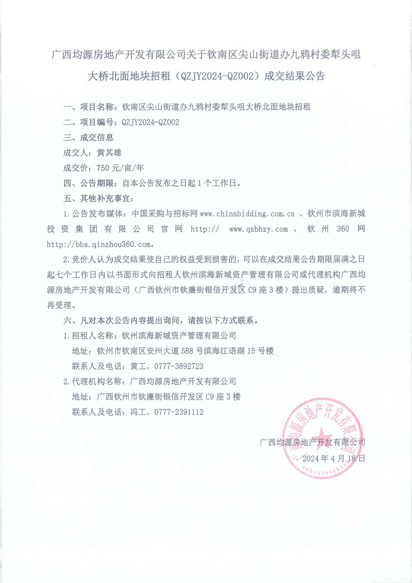 關(guān)于欽南區(qū)尖山街道辦九鴉村委梨頭咀大橋北面地塊招租成交結(jié)果公告