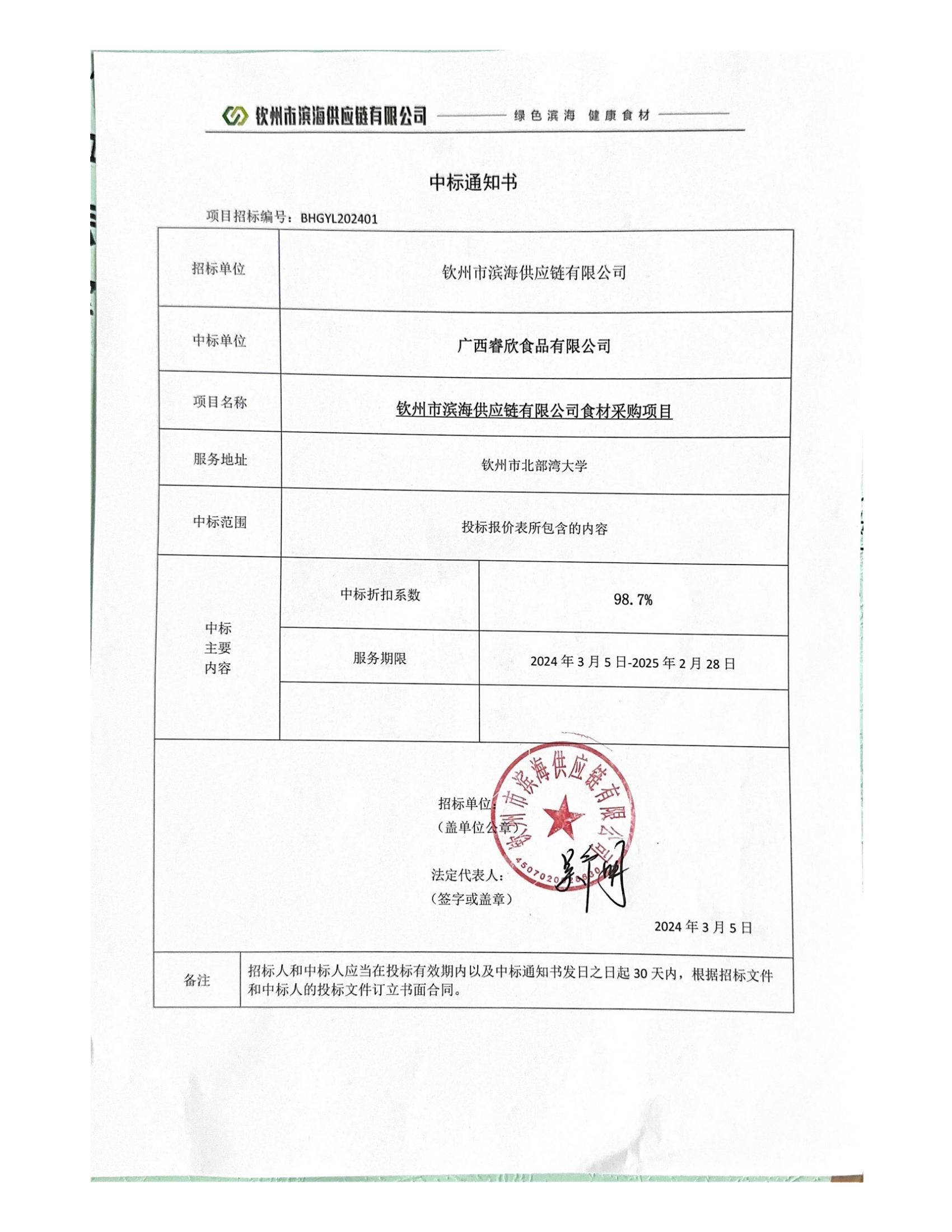 中標(biāo)通知書(欽州市濱海供應(yīng)鏈有限公司食材采購(gòu)項(xiàng)目)