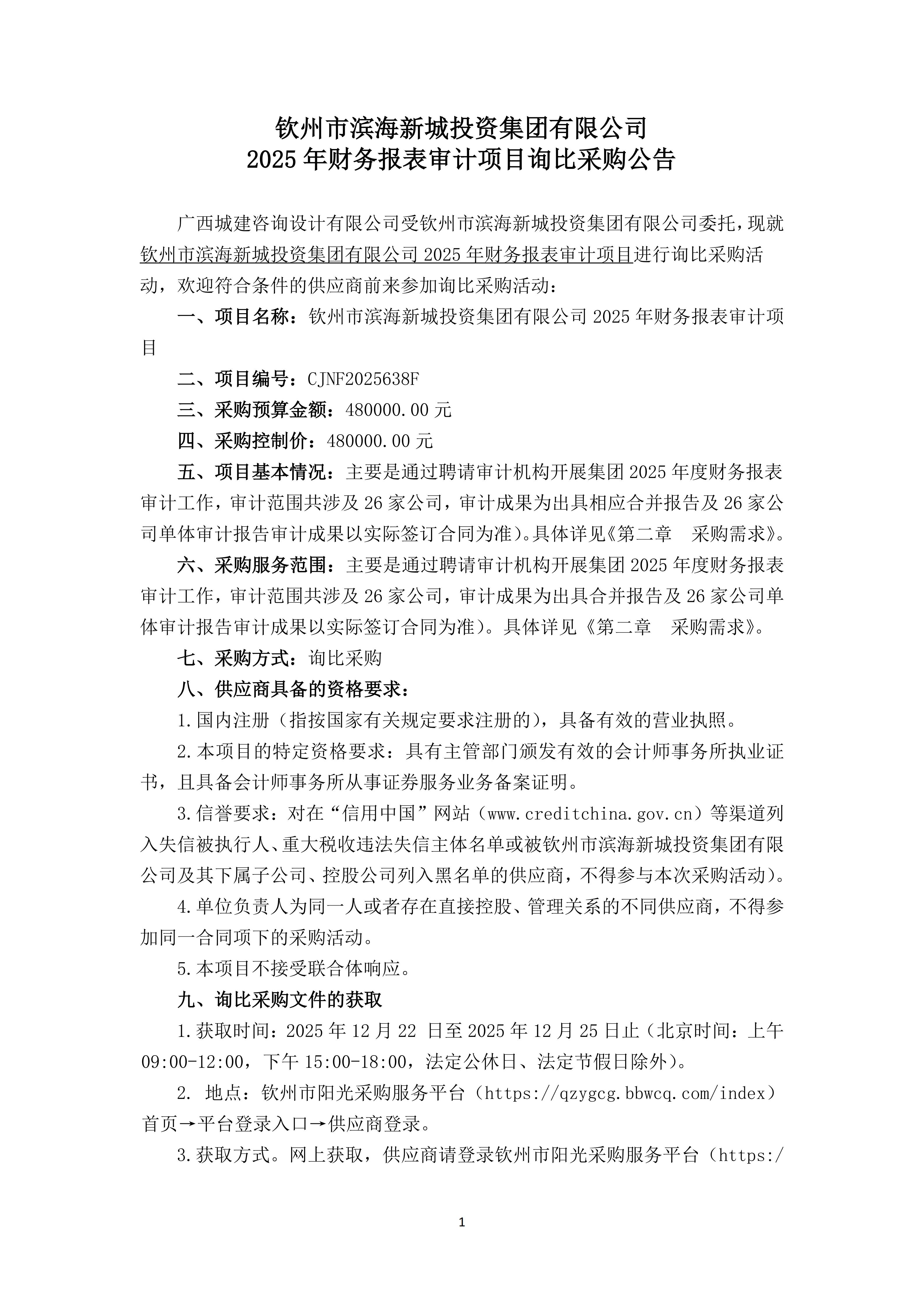 欽州市濱海新城投資集團(tuán)有限公司2025年財(cái)務(wù)報(bào)表審計(jì)項(xiàng)目詢比采購(gòu)公告