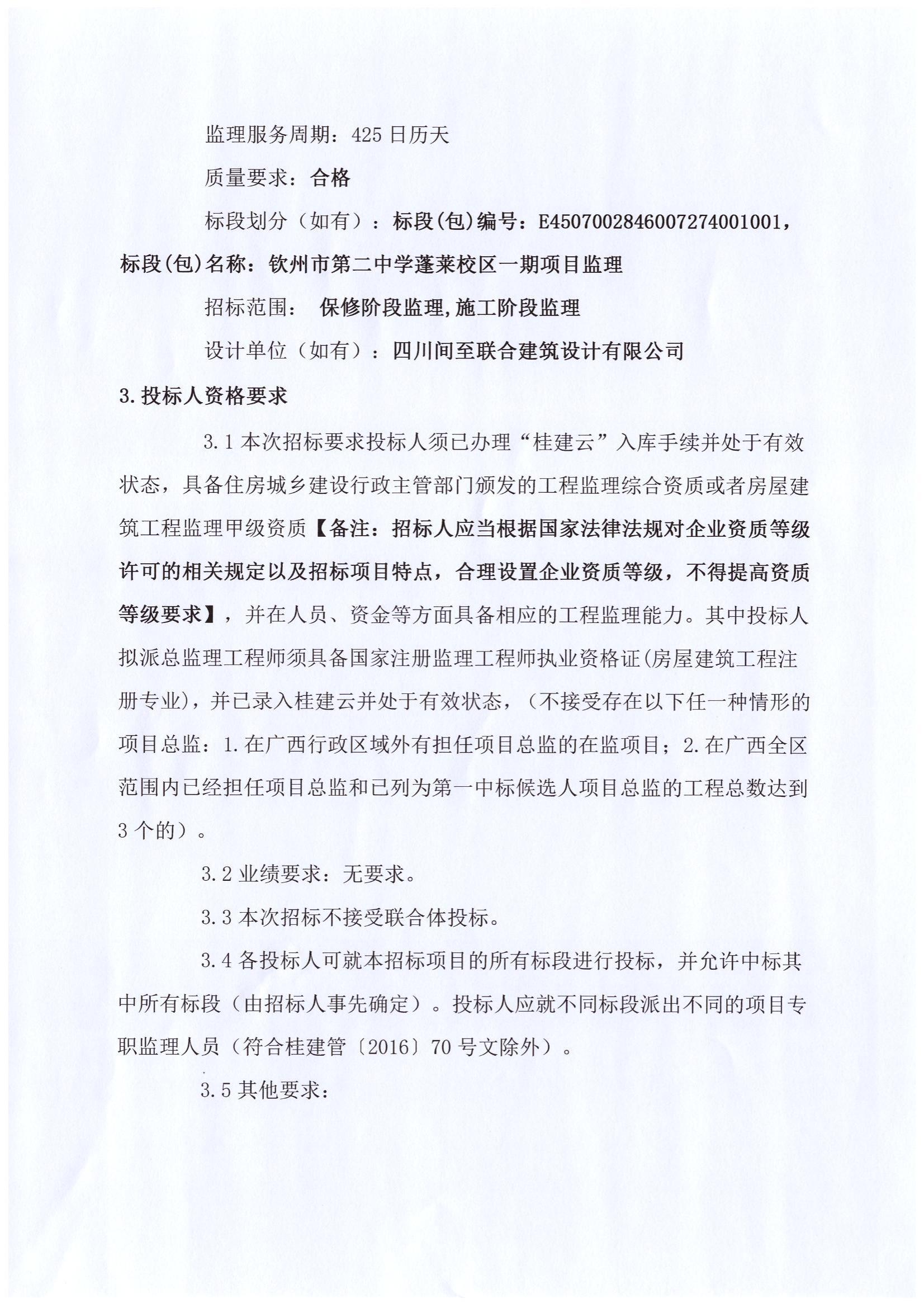 欽州市第二中學蓬萊校區(qū)一期項目監(jiān)理招標公告