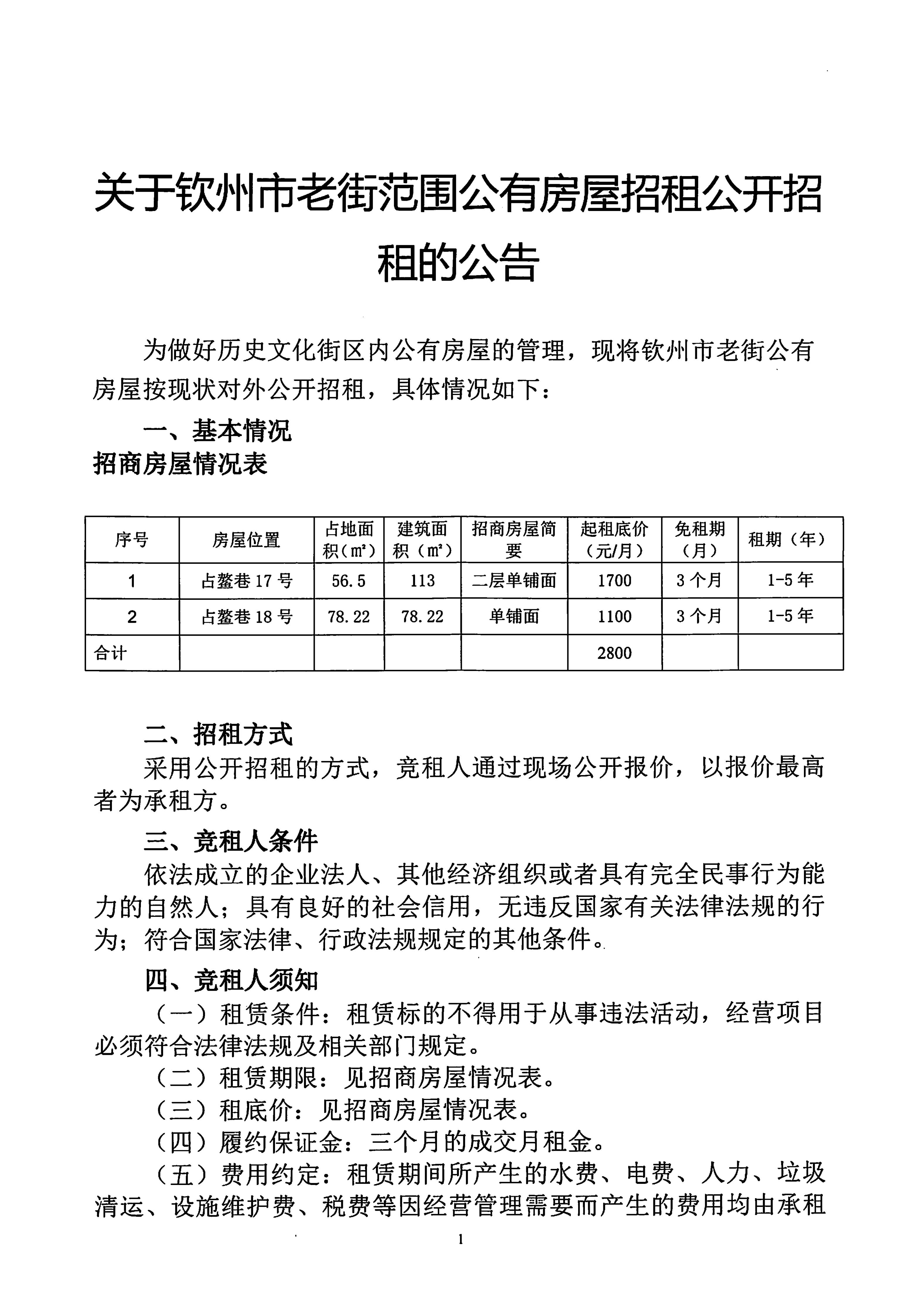 關(guān)于欽州市老街范圍公有房屋招租公開招租的公告